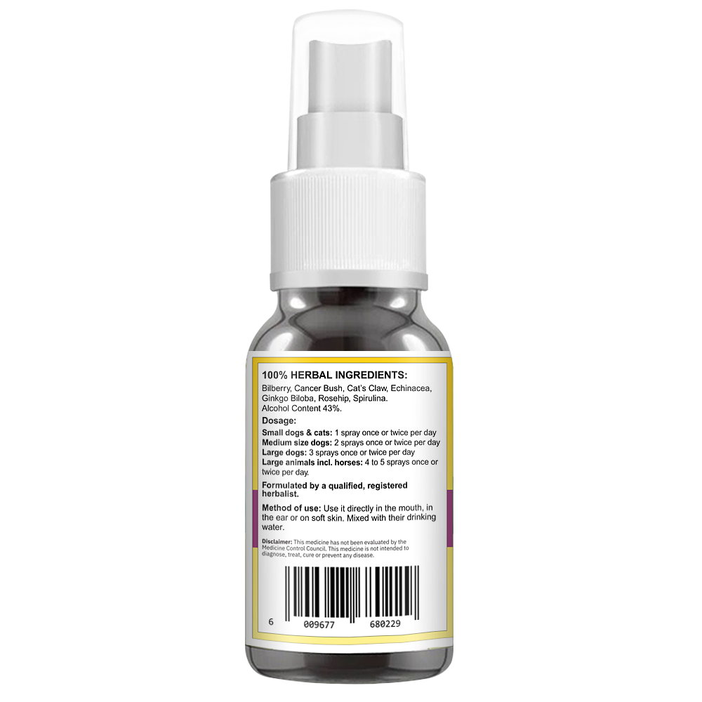 Shake well before use. Small dogs & cats: 1 spray once or twice per day Medium-size dogs: 2 sprays once or twice per day Large dogs: 3 sprays once or twice per day Larger animals (including horses): 4 to 5 sprays once or twice per day Formulated by a qualified, registered herbalist