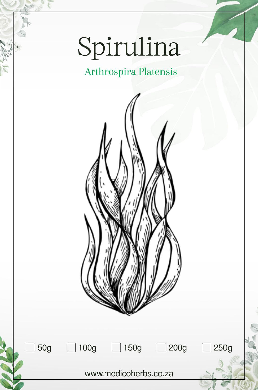 Spirulina is extremely high in Chlorophyll, which helps remove toxins from the blood and boost the immune system. Spirulina has a very high concentration of bio-available iron and is excellent during pregnancy and for those with anemia and will not cause constipation. Spirulina is a great source of other nutrients including (according to Wikipedia): Spirulina contains vitamins B-1(thiamine), B-2 (riboflavin), B-3(nicotinamide), B-6 (pyridoxine), B-9 (folic acid), vitamin C, vitamin D, vitamin A, and vitamin E. It is also a source of potassium, calcium, chromium, copper, iron, magnesium, manganese, phosphorus, selenium, sodium, and zinc.
