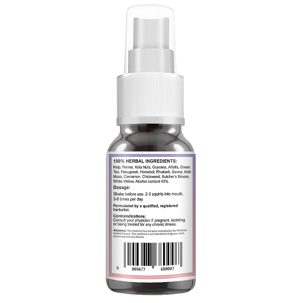 The Spray Slim formula will help you lose weight in a healthy and natural way. It will help with the underactive thyroid, aid in dissolving fat within the liver, enhance digestion, especially the metabolism of fats, and increases the excretion of unwanted fluids. It also helps cleanse the colon, kidneys, liver, spleen and acts as a mild appetite suppressant. This formula boosts the metabolic rate and has a balancing effect on the hormones.